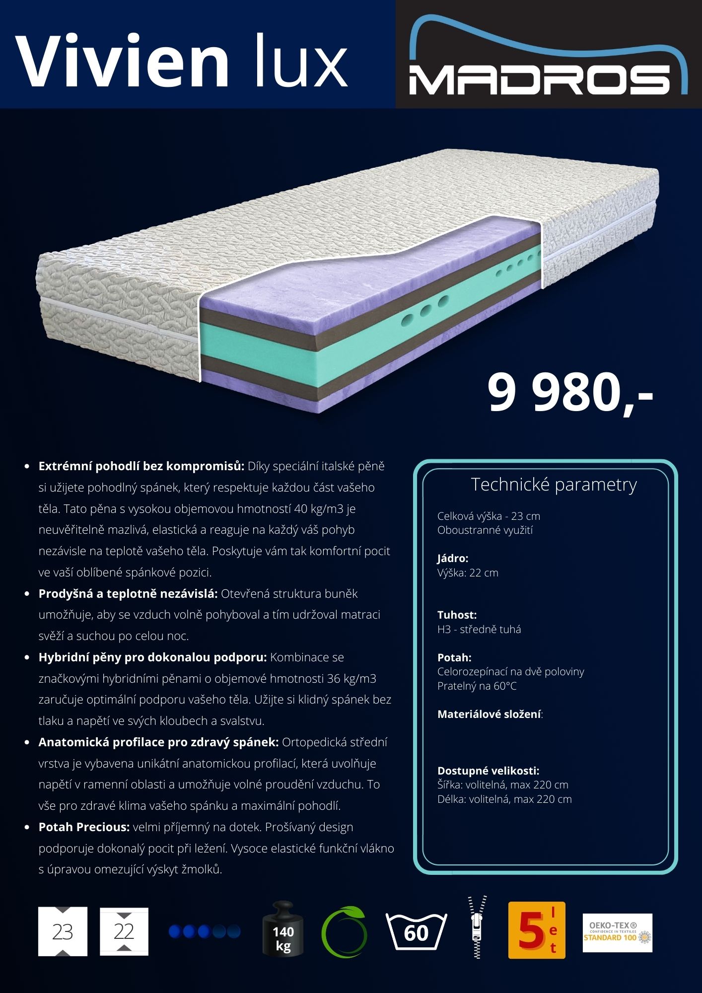 Hybridní pěny pro dokonalou podporu: Kombinace se značkovými hybridními pěnami o objemové hmotnosti 36 kg/m3 zaručuje optimální podporu vašeho těla. Užijte si klidný spánek bez tlaku a napětí ve svých kloubech a svalstvu.