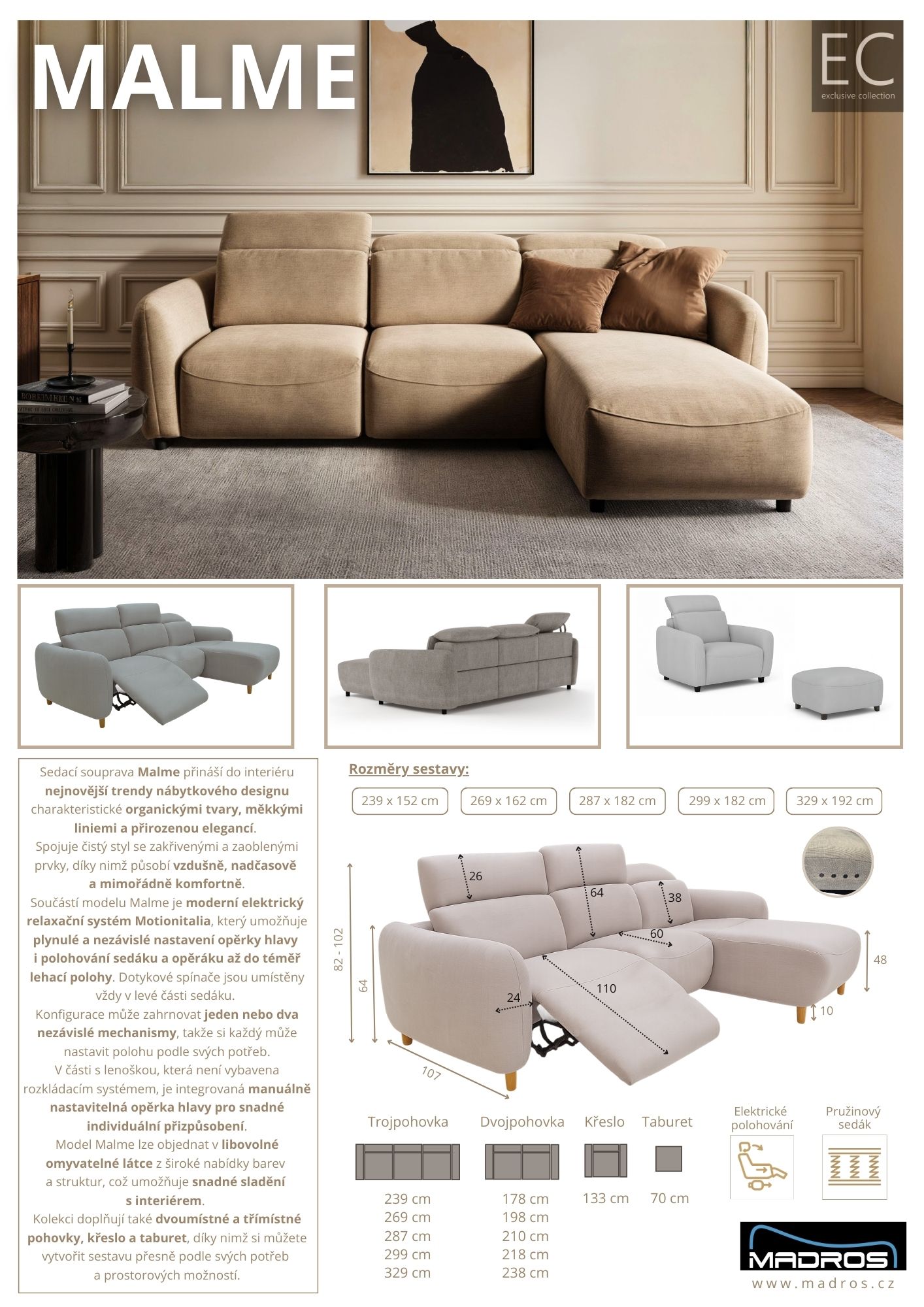 Výrazným prvkem modelu Malme je moderní elektrický relaxační systém Motionitalia, který umožňuje nezávislé plynulé polohování sedáku, opěráku i opěrky hlavy až do téměř lehací pozice. Tato funkce přináší vysoký uživatelský komfort a umožňuje každému nastavit si ideální relaxační polohu. U části s lenoškou je umístěna manuálně nastavitelná opěrka hlavy, která doplňuje možnosti individuálního přizpůsobení.